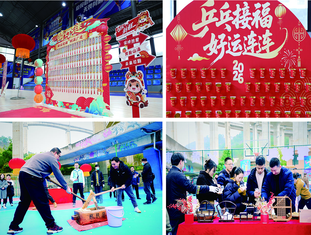与此同时,新春游园区域年味十足、其乐融融。“灯谜集福”吸引大家驻足思考,重温猜灯谜的传统文化魅力;“乒乓接福”“迎春射福”“套个福运”等打卡点前排起长队,职工们纷纷一试身手,争相赢取新年好彩头;传统年俗“打糍粑·品年味”体验区尤为热闹,大家亲手捶打、分享香甜软糯的糍粑,在热气蒸腾中共话团圆、感受温暖。