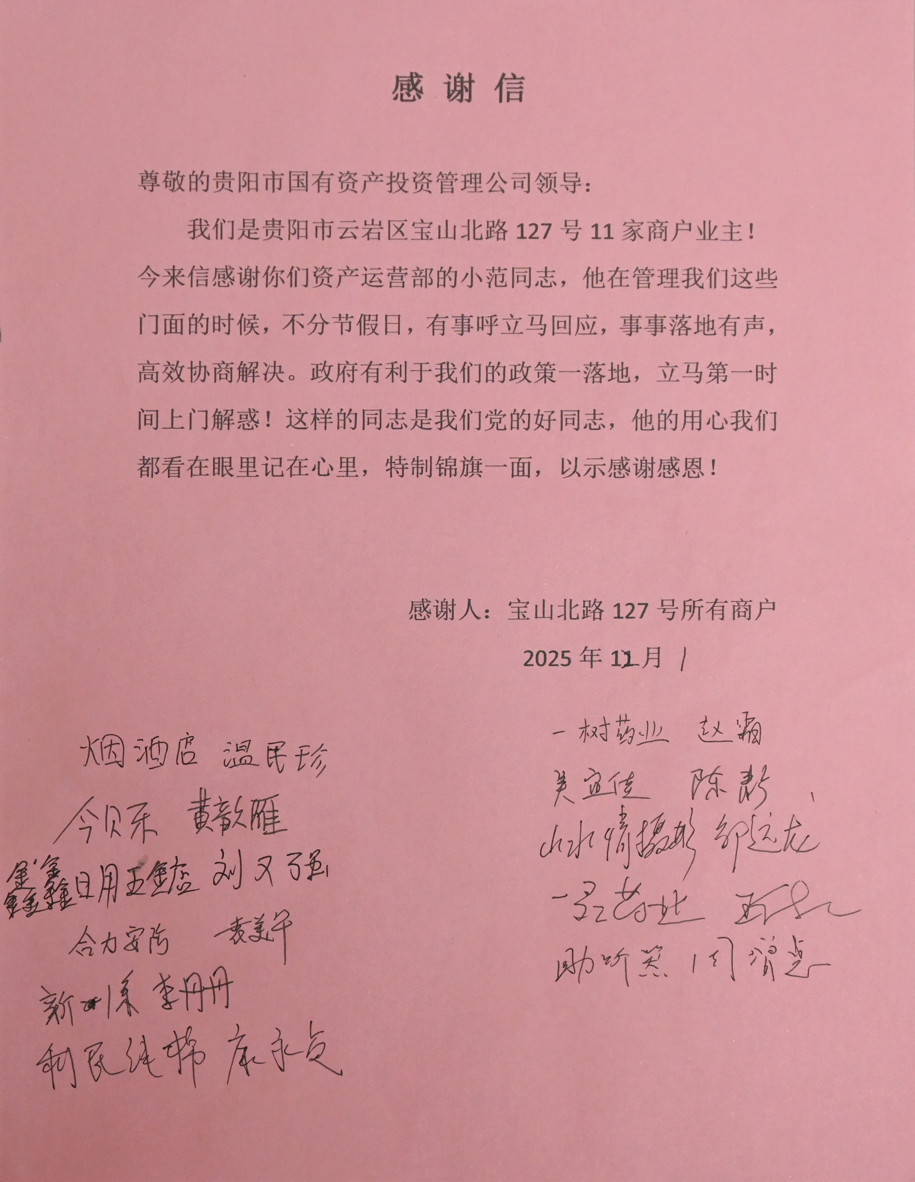 近日,国资公司收到一封来自宝山北路127号11家商户的联名感谢信和一面题为“真情暖人心、实干办实事”的锦旗。信中以朴实而真挚的话语,表达了对国资公司员工“小范”细致周到服务的高度认可,更折射出国资公司作为国有企业深耕服务、履职为民的扎实作风。